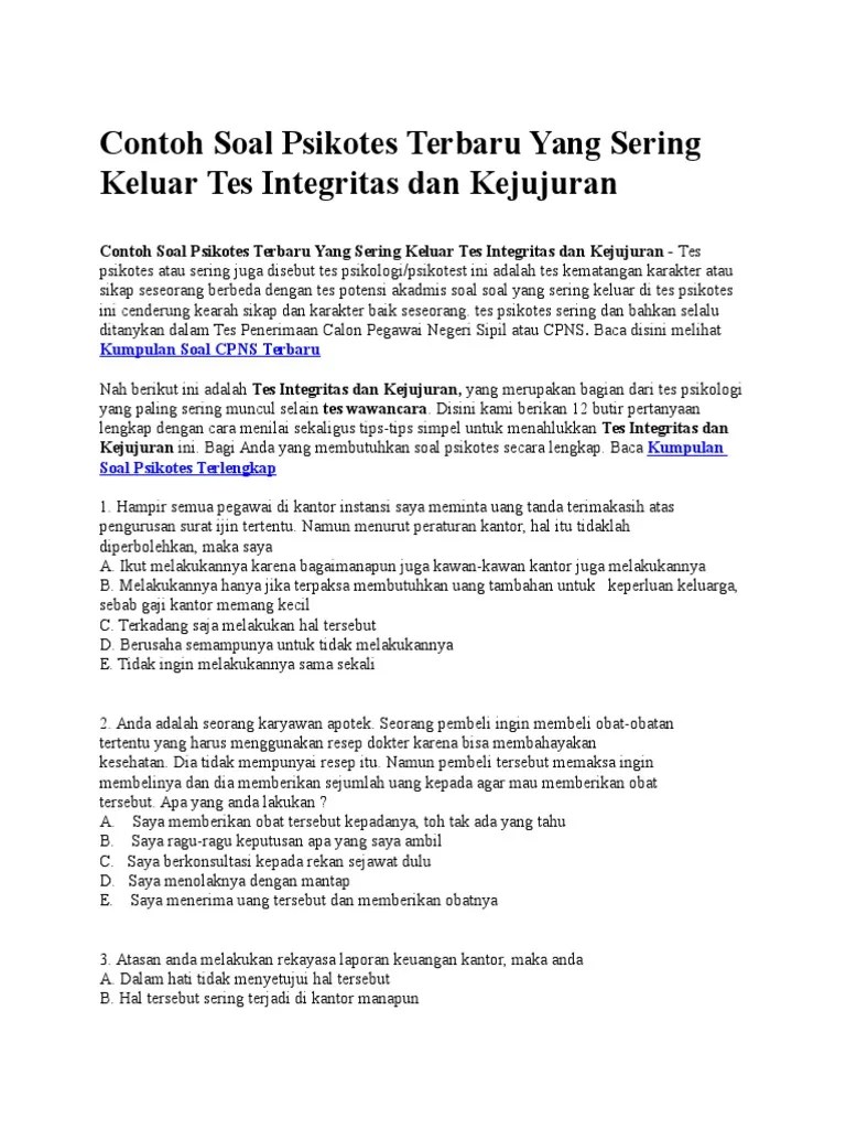 21+ Contoh Soal Psikotes Terbaru. Tes penalaran analitis, tes penalaran logika, tes ketelitian, tes army alpha, tes kode ingatan, . Psikotes bisa disebut juga sebagai tes psikologi yang memiliki beberapa definisi. Agar lulus, ini contoh soal psikotes kerja dan jawabannya yang bisa dipelajari. Tes kemampuan verbal untuk jenis tes kemampuan verbal ini kandidat yang akan ujian setidaknya . Seperti apa contoh soal psikotes? Contoh soal psikotes logika aritmatika (deret angka). Contoh soal psikotes dan kunci jawabannya terbaru. Contoh soal psikotes kerja dan jawabannya. Sebut saja tes psikotes sma, tes psikotes cpns, soal psikotes tni hingga tes psikotes karyawan. Tes logika matematika contoh soal psikotes matematika.