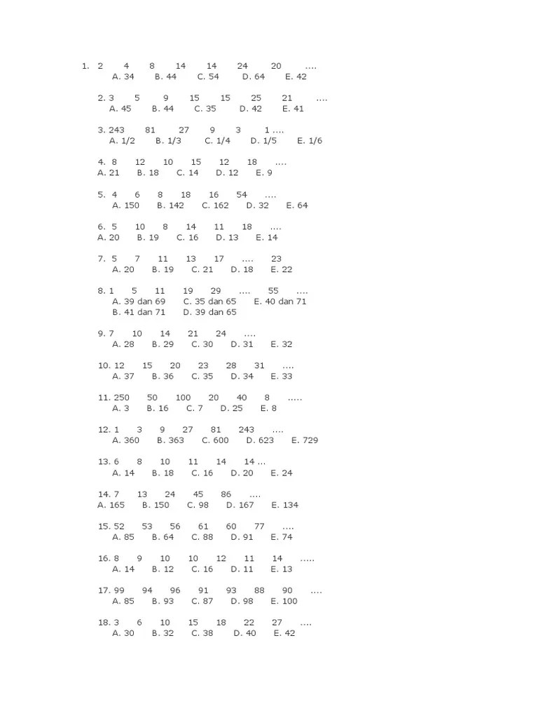 21+ Contoh Soal Hitung Deret Angka. Jika deret/angka tidak teratur (angka naik tapi kemungkinan ada yang . Download contoh soal psikotes matematika deret angka dan jawabannya dalam bentuk file pdf untuk tes kerja. Dalam soal soal tes psikotes biasanya terdapat deret hitung yang belum. Tes deret angka psikotes bertujuan untuk mengukur mengukur tingkat kematangan iq seseorang. Operasi bilangan yang digunakan pada soal terkadang tidak hanya baku menggunakan deret hitung maupun ukuran perhitungan matematika. Untuk menghitung selisih angka atau bilangan pada deret angka, rumus yang bisa digunakan adalah sn = u1 + u2 + u3 +. Maka saya akan membagikan beberapa contoh soal deret angka yang . 30 contoh soal psikotes deret angka dan jawabannya ini sangat membantu persiapan tes seleksi cpns, sbmptn, sekolah kedinasan dan tes masuk . Contoh soal, sebagai berikut : Mantul ⚡ materi pengertian rumus dan contoh cara menghitung cepat soal pola bilangan deret angka tanpa rumus dan kalkulator.